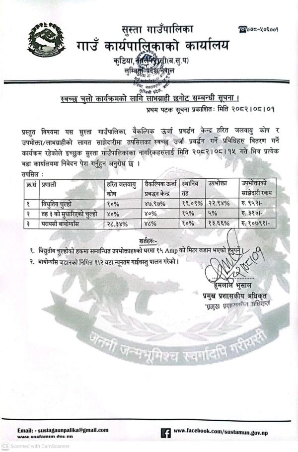 स्वच्छ चुलो कार्यक्रमका लागि लाभग्राही छनोट सम्बन्धी सूचना !