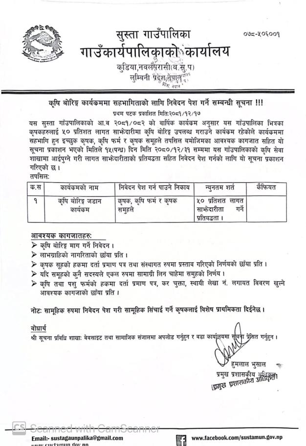 कृषि बोरिङ्ग कार्यक्रममा सहभागिताको लागि निवेदन पेश गर्ने सम्बन्धी सूचना