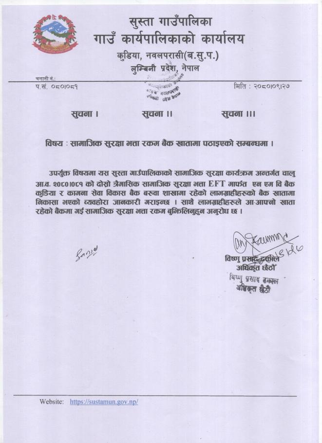 चालु आ.ब. २०८०।८१ को दोस्रो त्रैमासिक सामाजिक सुरक्षा भत्ता रकम लाभग्राही बैंक खातामा पठाईएको बारे सूचना ।