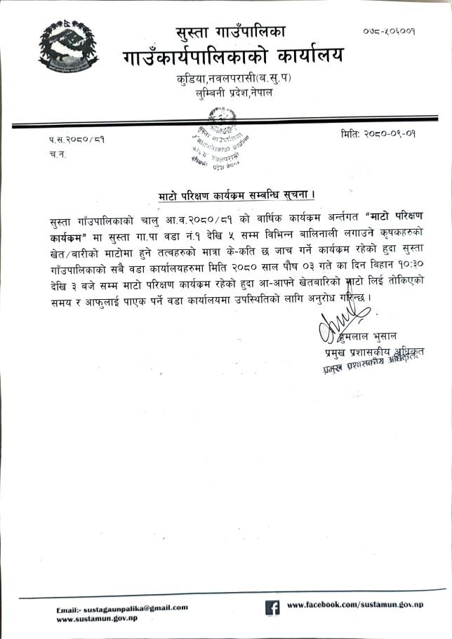 माटो परिक्षण कार्यक्रम सम्बन्धि सुचना ।