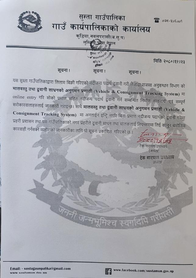 लिलाम बिक्री गरिएको नदिन्य पदार्थ ढुवानी गर्दा Vehicle & Consignment Tracking System को प्रयोग गर्ने बारे सूचना ।
