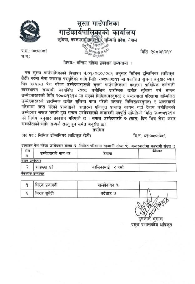 विज्ञापन नं. ०१/०८०/०८१ सिभिल इन्जिनियर (अधिकृत छैठौं) पदको अन्तिम नतिजा प्रकाशन सम्बन्धी सूचना ।
