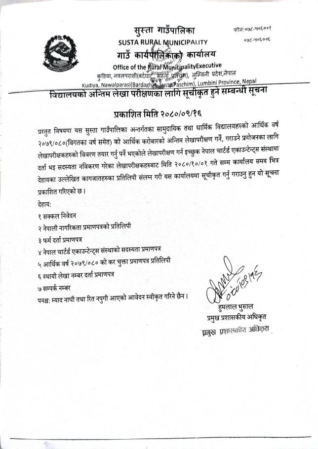 विद्यालयको अन्तिम लेखा परीक्षणका लागि सूचीकृत हुने सम्बन्धी सूचना ।