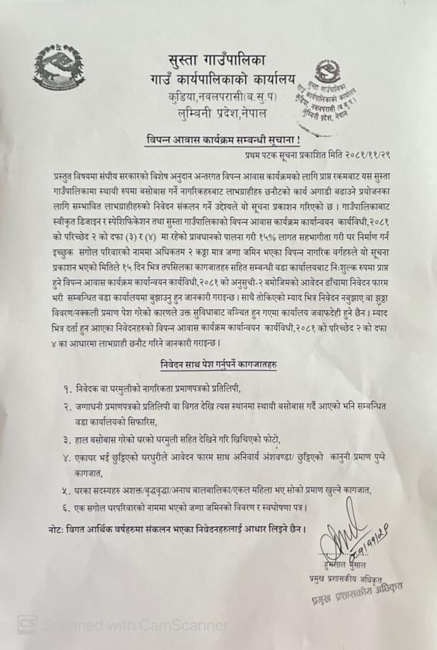 विपन्न आवास कार्यक्रम सम्बन्धी सूचना !!
