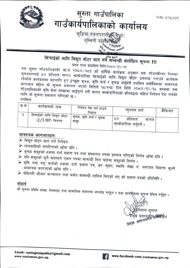 सिंचाईको लागि विद्युत मोटर माग गर्ने सम्बन्धी संशोधित सूचना ।