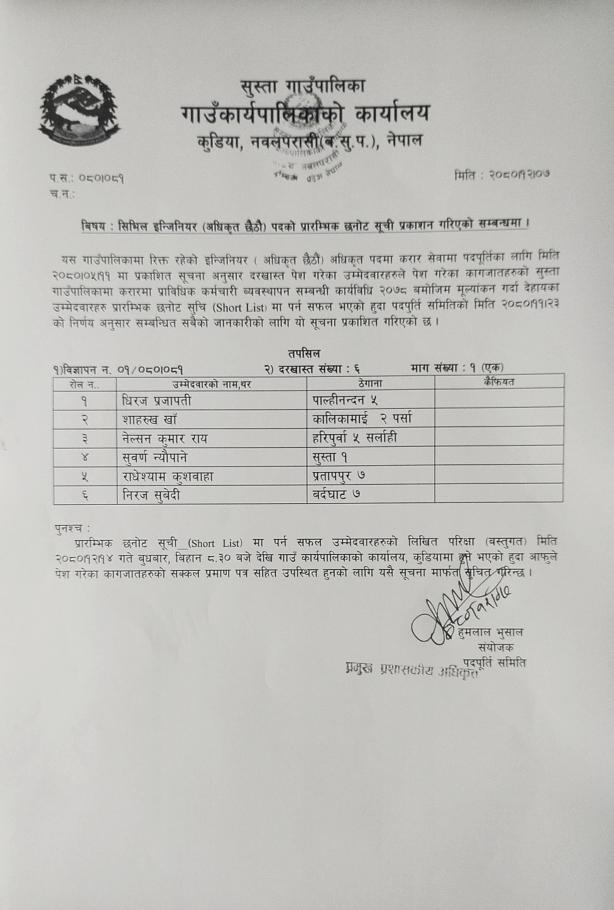सिभिल इन्जिनियर (अधिकृत छैठौँ) पदको प्रारम्भिक छनोट सूची प्रकाशन गरिएको सम्बन्धी सूचना ।