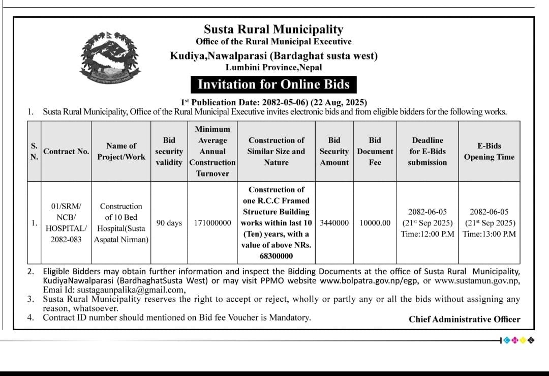 सुस्ता अस्पताल निर्माणको ठेक्का आह्वान सम्बन्धि सुचना!!!