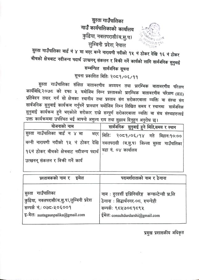 सुस्ता गाउँपालिका वार्ड नं. ४ मा भएर बग्‍ने नारायणी नदीको १५ नं. ठोकर देखि १६ नं. ठोकर बीचको क्षेत्रबाट नदीजन्य पदार्थ उत्खन्न, संकलन र विक्री गर्ने कार्यको लागि सार्वजनिक सुनुवाई सम्बन्धी सार्वजनिक सूचना ।