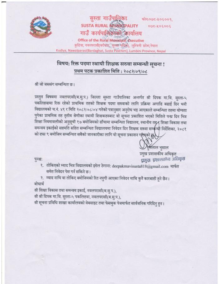 रिक्त पदमा स्थाई शिक्षक सरुवा सम्बन्धी सुचना!